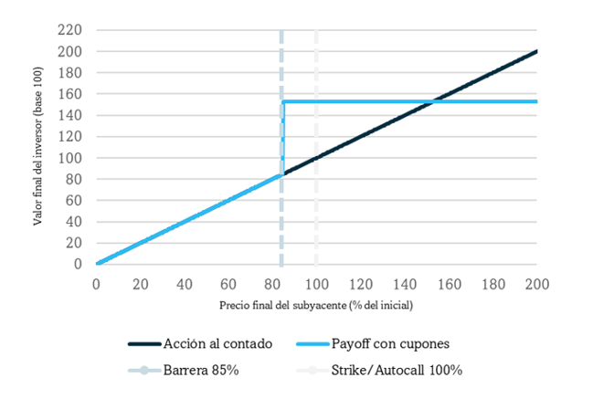- Si la acción se revaloriza y supera el 100% del precio inicial (strike), el producto autocancela y devuelve el nominal más el cupón. En este escenario, el riesgo es no capturar toda la revalorización del valor (es un coste de oportunidad dado que estás expuesto al riesgo de caída; el debate es si ese riesgo está bien remunerado mediante el elevado cupón que se cobra que, por otra parte, no es seguro). Este último punto es clave: en este tipo de estructuras, el riesgo no es tanto (o no solo) perder dinero, sino no ganar tanto como con la acción si se revaloriza de forma destacada. Si crees que el subyacente se va a revalorizar con intensidad, es mejor que lo adquieras directamente.