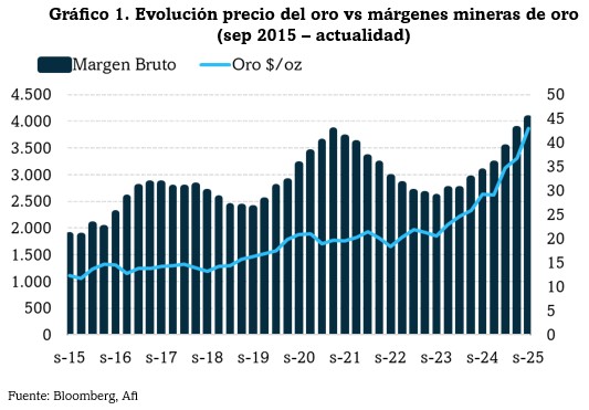 El negocio de las mineras de oro se basa en la extracción y producción del metal. Por lo tanto, la clave de sus beneficios está en el diferencial entre la cotización de la onza y su coste de producción (AISC, All-In Sustaining Cost). Dado que gran parte de los gastos de las mineras son fijos (infraestructura, licencias, personal, maquinaria), las variaciones en el precio del oro se trasladan de forma amplificada a sus márgenes, de modo que los periodos de subida del metal incrementan de manera significativa la rentabilidad, mientras que las caídas reducen de forma acusada los beneficios. En última instancia, la evolución de los resultados depende de la capacidad de mantener controlados los AISC, cuyo comportamiento ha sido especialmente relevante en los últimos años.