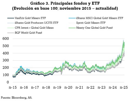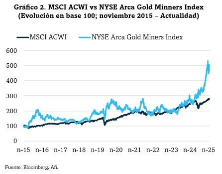 El patrón es claro: el oro físico se consolida como activo refugio, aportando cobertura en episodios de incertidumbre y preservando valor dentro de carteras diversificadas. En paralelo, las compañías mineras auríferas proporcionan una exposición más apalancada al metal a través de una beta superior, lo que permite capturar con mayor intensidad los tramos alcistas del ciclo y, al mismo tiempo, añadir un factor de descorrelación frente a la renta variable global.