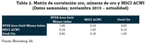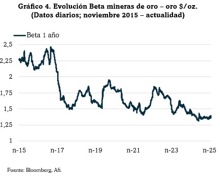 Más allá de su atractivo táctico en un contexto actual, las mineras de oro también cumplen un papel relevante desde el punto de vista de la diversificación de carteras de renta variable. Históricamente, la correlación entre el precio del oro y la cotización de las compañías mineras ha sido elevada (0,82 en la última década). Sin embargo, esa misma relación contrasta con su baja correlación frente a la renta variable global: apenas un 0,34 con el MSCI ACWI, lo que las convierte en un componente interesante dentro de estrategias de diversificación.