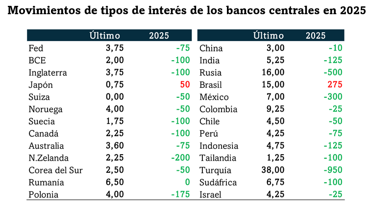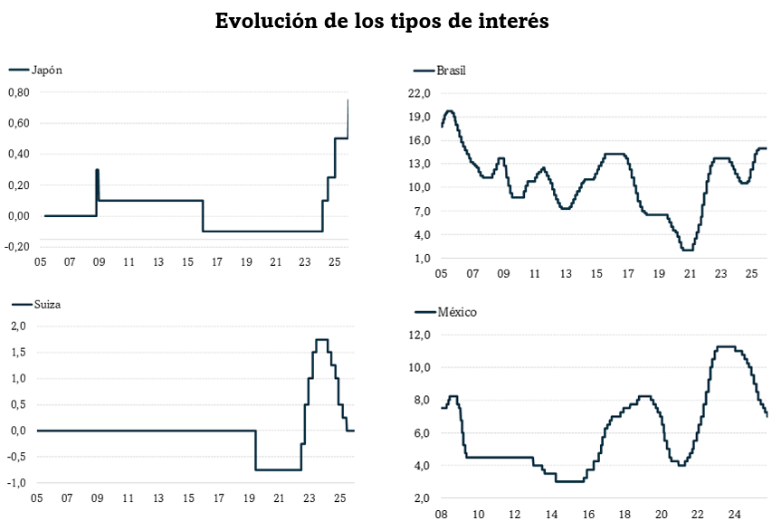 Respecto a la Fed, las expectativas que había en diciembre de 2024 eran que asistiéramos a dos rebajas. Aunque el banco central de EE.UU. retomó la senda de recortes más tarde de lo esperado (septiembre), a la espera de tener más visibilidad sobre el impacto de los aranceles en el crecimiento y la inflación, el año se salda con tres rebajas y, lo que es más importante, con expectativas de relajaciones adicionales en 2026. Ahora bien, no hay consenso en el mercado sobre su cuantía, como reflejo de las discrepancias en el seno del FOMC. Éstas son fruto tanto de las “injerencias políticas” como del debate sobre cómo debe reaccionar un banco central que se enfrenta a un crecimiento del PIB del 2,3%, una inflación del 2,4%, una tasa de paro del 4,4%, un tipo de intervención en el 3,5% - 3,75%.