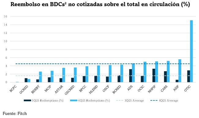 Precisamente la cuestión adquiere mayor relevancia cuando el crédito privado se canaliza hacia inversores retails a través de vehículos “semi-líquidos”. Recordemos que, en esencia, estos vehículos financian préstamos a largo plazo sin mercado secundario profundo y lo hacen respaldando pasivos que ofrecen ventanas periódicas de reembolso. Las BDCs, en su formato no cotizadas, suelen permitir reembolsos limitados del 5% trimestral del NAV. El problema en las últimas semanas es la persistencia de salidas superiores a esa capacidad de absorción y que, en algunos fondos, han supuesto activación de mecanismos de control de liquidez.