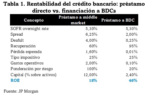 La brecha de ROE no responde necesariamente a una mayor rentabilidad económica del activo, sino al distinto tratamiento en términos de consumo de capital y ponderación por riesgo. Cuando el banco concede crédito directamente a una empresa, asume íntegramente el riesgo en balance; en cambio, al financiar a una BDC optimiza capital regulatorio y eleva el ROE de la misma inversión. El resultado incentiva a reforzar el modelo de “originar para distribuir”, donde el riesgo económico último se desplaza fuera del balance bancario, aunque la interconexión y la provisión de liquidez permanezcan dentro del sistema.