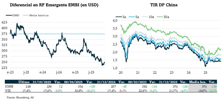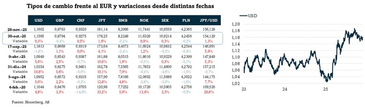 Sigue la recuperación del RMB contra el USD. En noviembre gana un 0,6% por lo que se aprecia un 3,8% en 2025. Contra el EUR cierra sin cambios, pero pierde un 7,5% en el año ante la apreciación de nuestra moneda contra el USD.