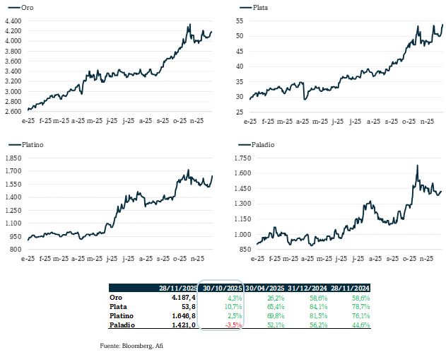 Entre el 20 y el 28 de octubre la cotización del oro y la plata cayó un 8,5% y un -7,9%, respectivamente, sin factores fundamentales que explicaran esta caída. De hecho, desde esos mínimos se encaren un 5,6% y un 13,7%, respectivamente, lo que permite a la plata situarse en nuevos máximos.