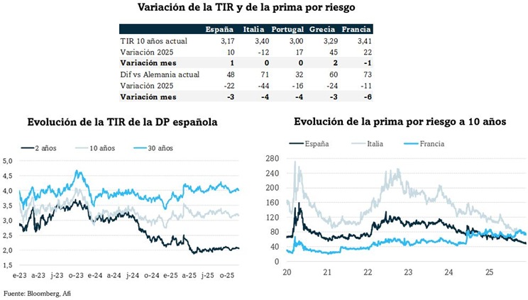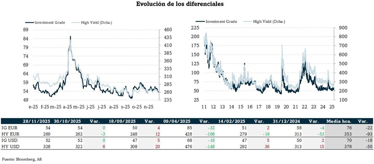 Noviembre se salda sin cambios netos en los diferenciales en renta fija privada. Los actuales niveles (54 pb en IG y 260 pb en HY) están por debajo de las medias históricas (76 pb y 353 pb), pero por encima de los mínimos anuales del 18 de septiembre, cuando IG llegó a cotizar en 50 pb y HY en 248 pb.