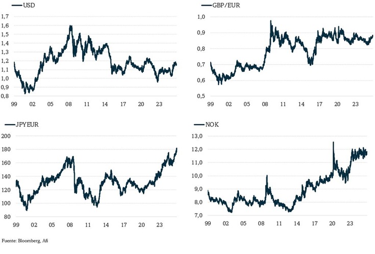 Regresa la apreciación del MXN (a pesar del nuevo recorte de tipos del Banco de México, hasta el 7,25%) y del BRL frente al USD. Ganan en noviembre un 1,6% y un 1,0%, respectivamente, por lo que ya se aprecian en 2025 un 12,8% y un 15,8%.