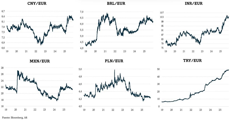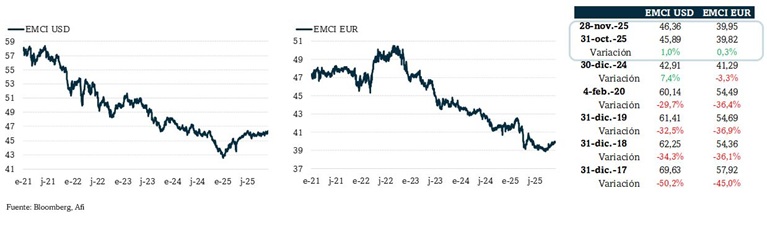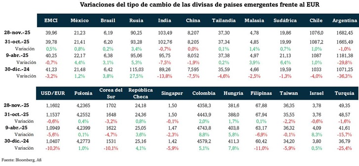 Tras los escasos cambios netos en octubre de las divisas emergentes contra el USD, en noviembre se renueva el movimiento de recuperación de meses atrás. Según el índice EMCI se aprecian un 1,0%, por lo que gana un 7,4% en 2025. El EMCI en EUR gana menos en noviembre (ante la ligera apreciación del EUR vs USD): un 0,3% y el movimiento en el año es una depreciación del 3,3%.