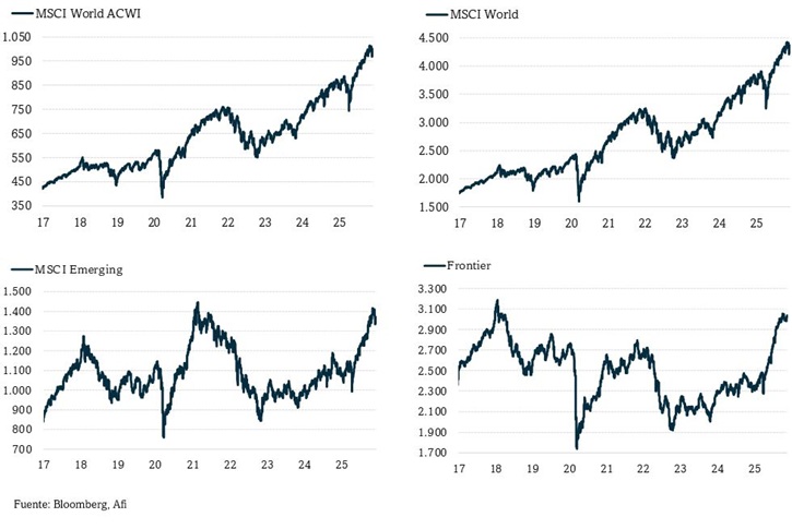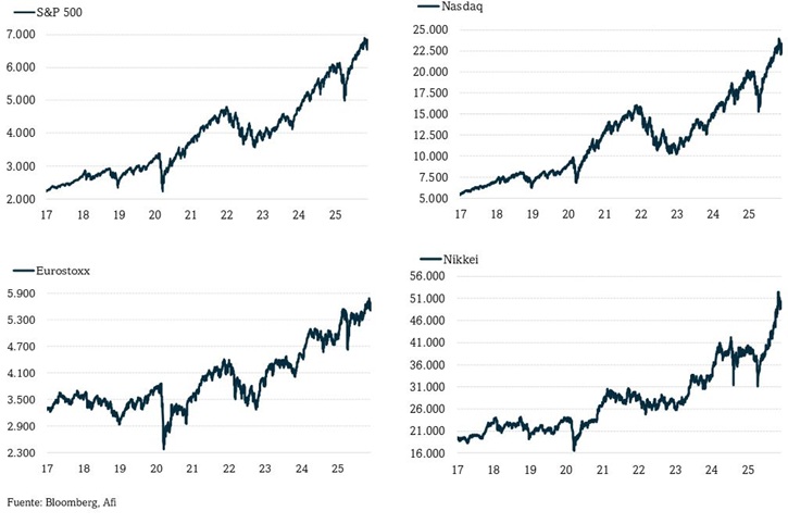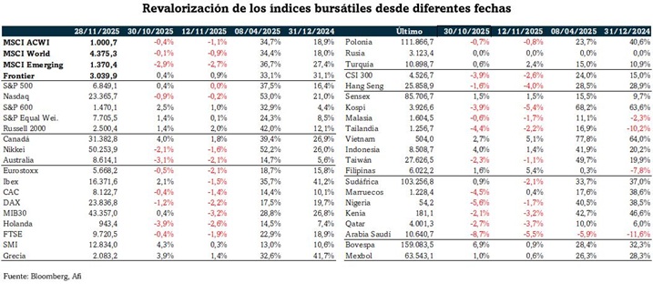 Tras varios meses consecutivos de alzas en las bolsas, noviembre se salda con escasas variaciones netas (a pesar de que MSCI ACWI marcó un nuevo máximo histórico el día 12). Entre los mercados que más suben sobresale el Bovespa (+6,9% mensual, +32,3% anual), el SMI suizo (4,3%; 10,6%), el Ibex 35 (2,1%; 41,2%) y el S&P 600 (2,5%; 4,4%) que, al igual que el S&P Equal Weighted (1,4%; 8,5%), baten tanto al S&P 500 (0,4%; 16,4%) como al Nasdaq. Este es uno de los mercados que, junto con China (-3,9%; 15,0%) y Corea del Sur (-3,9%; 63,6%), cierran noviembre con pérdidas (-0,9%; 21,0%). En noviembre se observan saldos dispares entre L7M: Alphabet gana un 13,9% (+69,1% en el año) mientras que Nvidia cae un 12,6% (+31,8% YTD). El Ibex 35 vuelve a mostrar un mejor comportamiento relativo (+2,1% vs -0,5% del Eurostoxx) ahora gracias a ArcelorMittal (12,1%), ACS (11,9%) y Solaria (11,1%). También los bancos contribuyen, al revalorizarse en noviembre entre el 3,7% de Bankinter y el 8,1% de Unicaja.