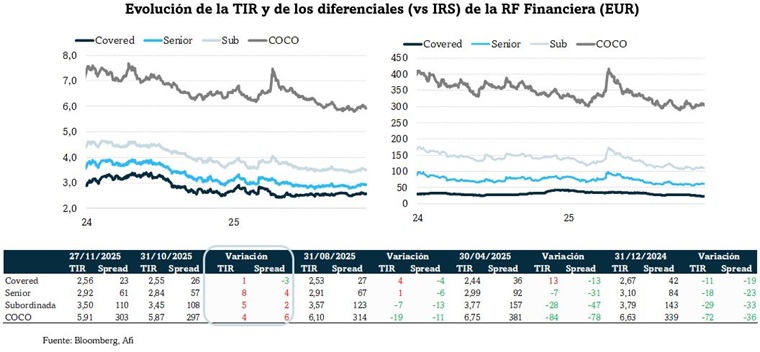 Escasas variaciones netas en los diferenciales en RF financiera en noviembre, por lo que cotizan en zona de mínimos anuales. Covered, con la caída de 3 pb, profundiza en esos mínimos (hasta 23 pb), mientras que el repunte mensual en senior (+4 pb, hasta 57), subordinada (+2 pb, hasta 110 pb) y CoCo (+4 pb, hasta 303 pb) es de escasa cuantía. La TIR de los CoCo se sitúa en un 5,91%, un nivel por debajo de la de mes anteriores (llegó a superar el 7,0% e, incluso, el 10% en marzo de 2023 con la quiebra de SVB y la conversión en CS), pero una cota todavía atractiva.