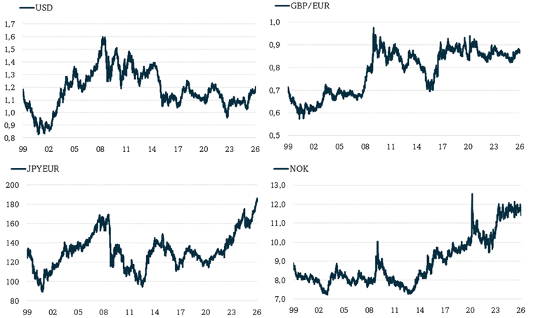 Con los momentos de máxima tensión respecto a Groenlandia -coincidentes con la cumbre de Davos- el USD se depreció con cierta intensidad (superó la cota de 1,20 contra el EUR). Pero en la última sesión del mes se ha apreciado, como reacción al nombramiento de Warsh como próximo presidente de la Fed. Cierra enero en 1,1851 USD/EUR, lo que, a pesar de todo, es una depreciación del 1,0% mensual.