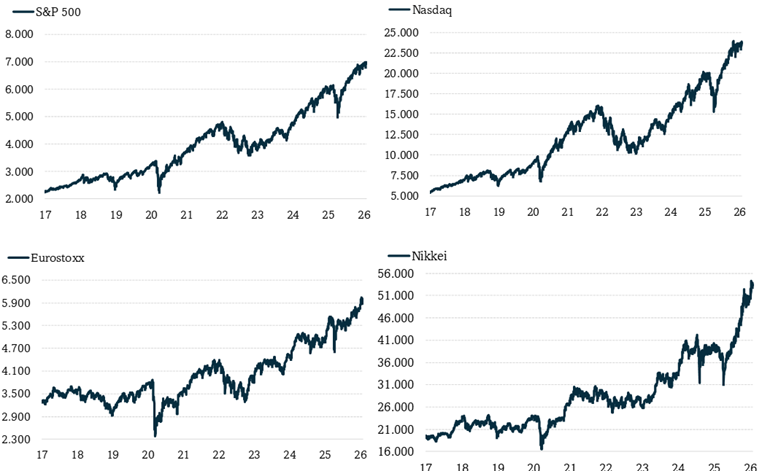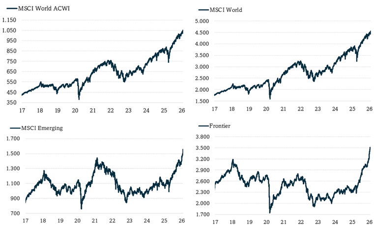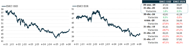 Tras un excelente 2025 (+20,6%) el MSCI ACWI arranca el año con una nueva revalorización mensual (+3,5%) impulsada en esta ocasión por los mercados emergentes. MSCI Emerging gana un +10,7% gracias a Corea (+24,0%), Brasil (+13,7%), Taiwán (+10,7%) y Hong Kong (+6,9%).