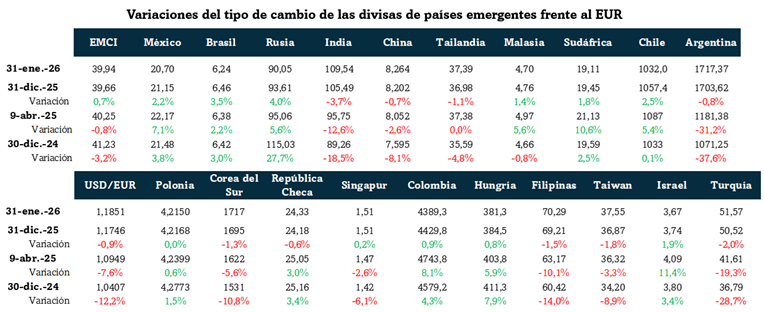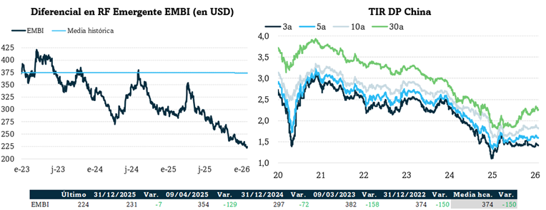 Sigue la recuperación del RMB vs USD. Tras la apreciación del 4,5% en 2025, gana un 0,4% en el inicio del año. Contra el EUR pierde un 0,7% ante la apreciación de nuestra moneda contra el USD (en 2025 cedió un 7,4%).