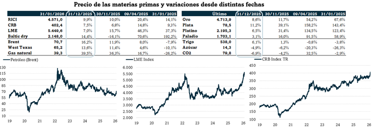 Uno de los mercados con más movimientos en enero ha sido el de materias primas. Aunque el derrocamiento de Maduro implica un aumento futuro de la oferta de petróleo, el mes salda con un importante encarecimiento: +16,2%, hasta 70,07 USD el barril tipo Brent.
