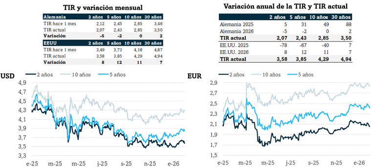 El año arranca con un repunte de la curva del USD, que es prácticamente en paralelo. El TNote a 2 años se eleva 8 pb, hasta el 3,58%, mientras que la referencia a 10 y 30 años lo hacen en 11 pb y 7 pb, respectivamente. Menos cambios netos en la curva alemana, donde la referencia a 2 años cae 5 pb, hasta el 2,07% y el Bund a 10 años cierra sin cambios (en el 2,85%). El movimiento más destacado se sigue observando en la curva del JPY. La TIR de la referencia a 30 años cotiza en el 3,61% (+24 pb en el mes), lo que contrasta con el 3,50% de Alemania (+ 2 pb en enero).
