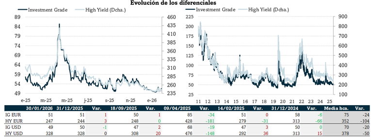Ausencia de movimientos netos mensuales relevantes en los diferenciales, por lo que se mantienen claramente por debajo de las medias históricas, tanto en grado de inversión (51 pb vs 75 pb) como en grado especulativo (247 pb vs 352 pb).