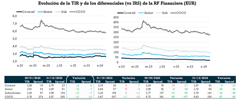 Continúa –e, incluso, se acelera- la cesión en los diferenciales en RF financiera. El movimiento más intenso es en CoCo, con una caída del spread de -21 pb en el mes (hasta 274 pb). En el caso de la deuda covered, la cesión del diferencial en el año es de -4 pb, hasta 19 pb. Cesión generalizada de TIR, hasta alcanzar el 5,76% en CoCo y 2,58% en covered.
